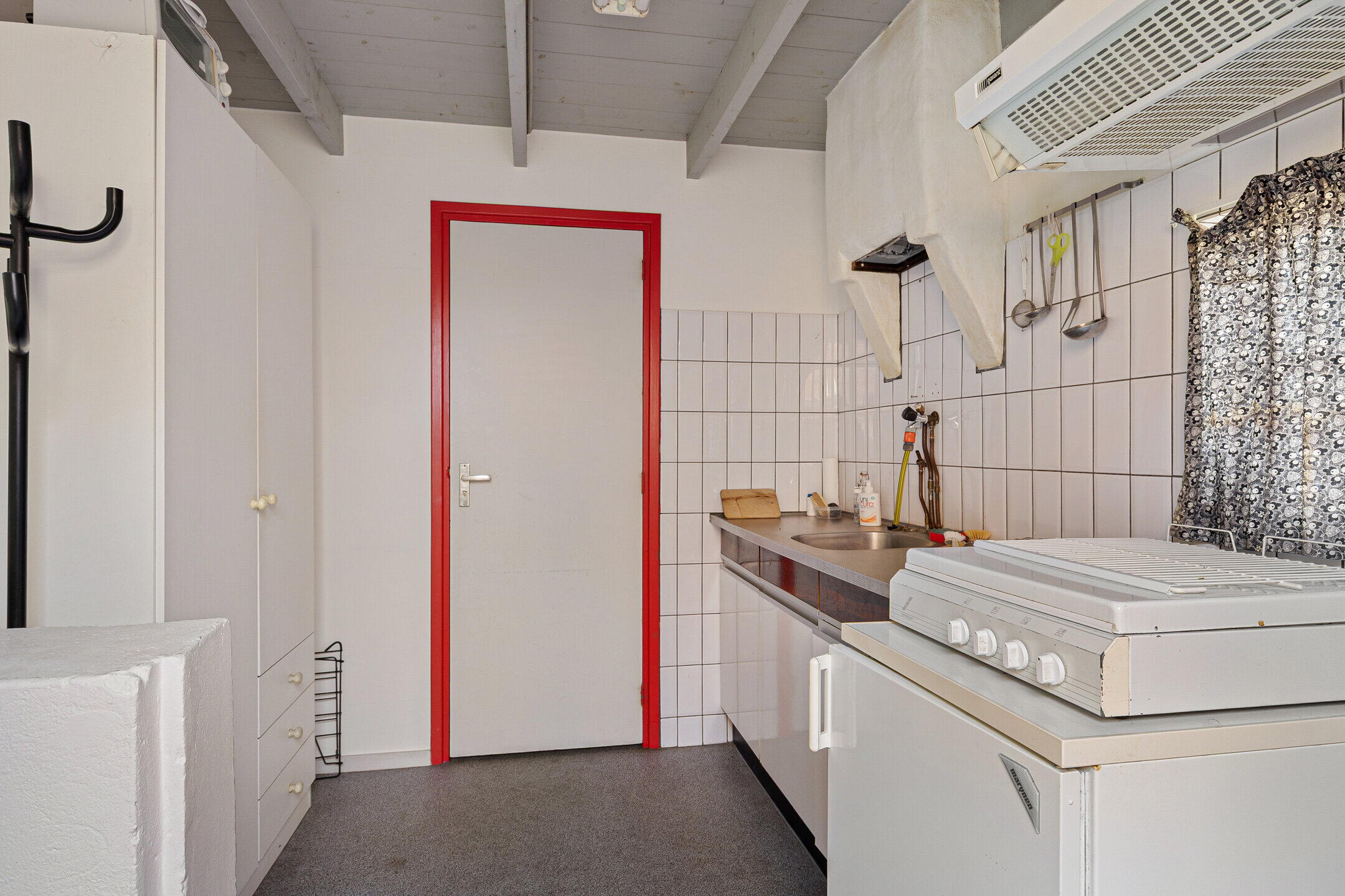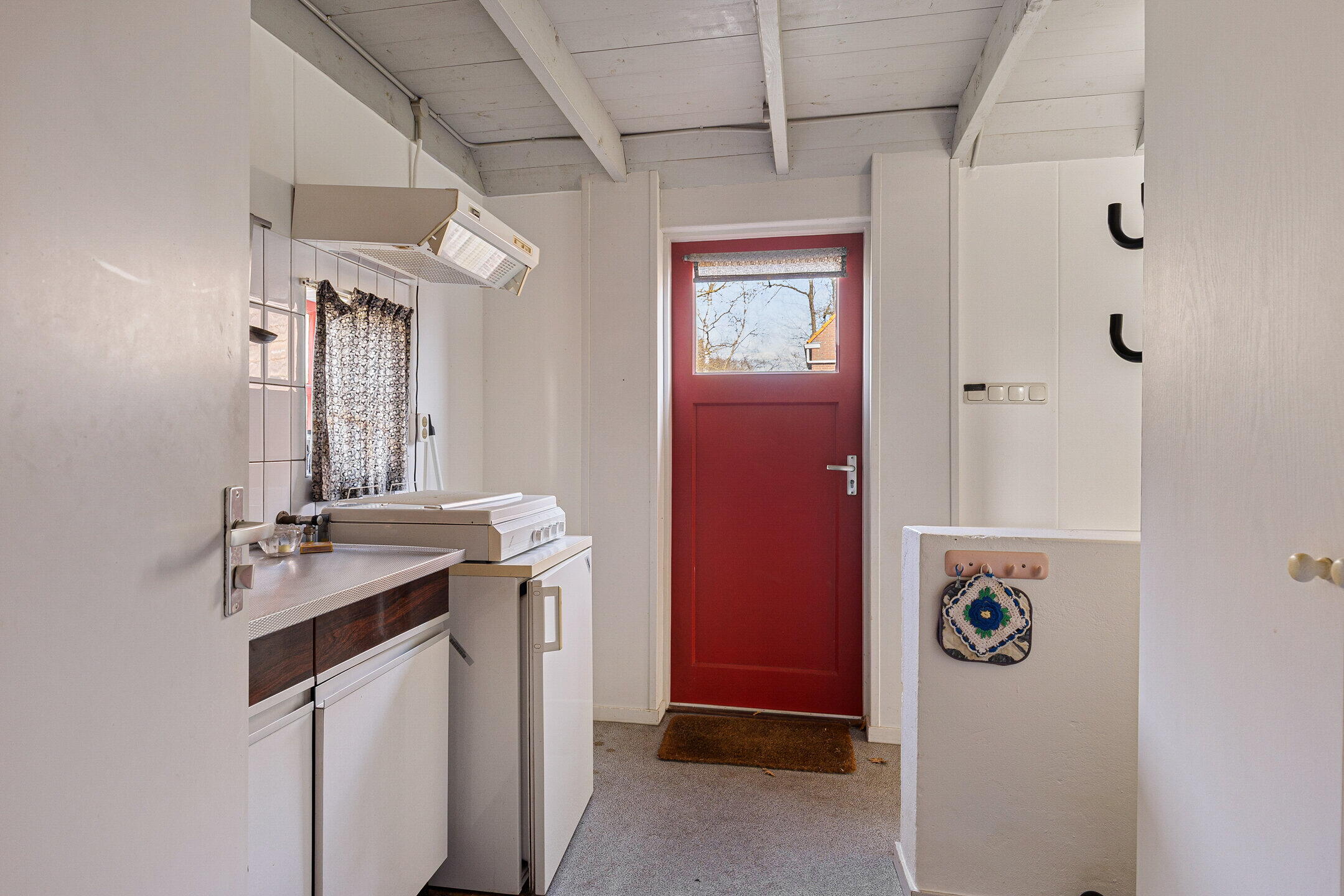 Entree met hal, trapopgang, kelder en ruime vaste kast, toegang tot de woonkamer of de keuken met eenvoudige keukeninrichting. Vanuit de keuken een corridor/bijkeuken met toilet en buitendeur en aansluitend de aanbouw met gang, badkamer, berging en enkele vertrekken tbv bewoning en/of hobby. ( de begane grond van de woning is ca. 7 x 5 m en van de woningaanbouw ca. 12,5 x 12,5 m)